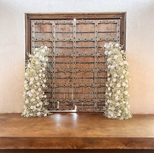 The Heavenly Arch features two open, curved pillars styled with lush white roses and baby’s breath, creating a soft, romantic focal point for your big day.